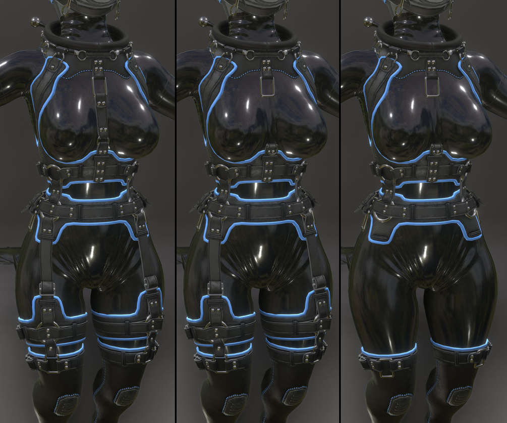 The gear has 'blendshapes' to make it fit the avatars various shapes for that perfect fit. Harness has the option to hide thigh straps/belts. The Jex's bridle can have its jaw strap hidden and the blinkers on both bridles can be splayed/narrowed or hidden as well.