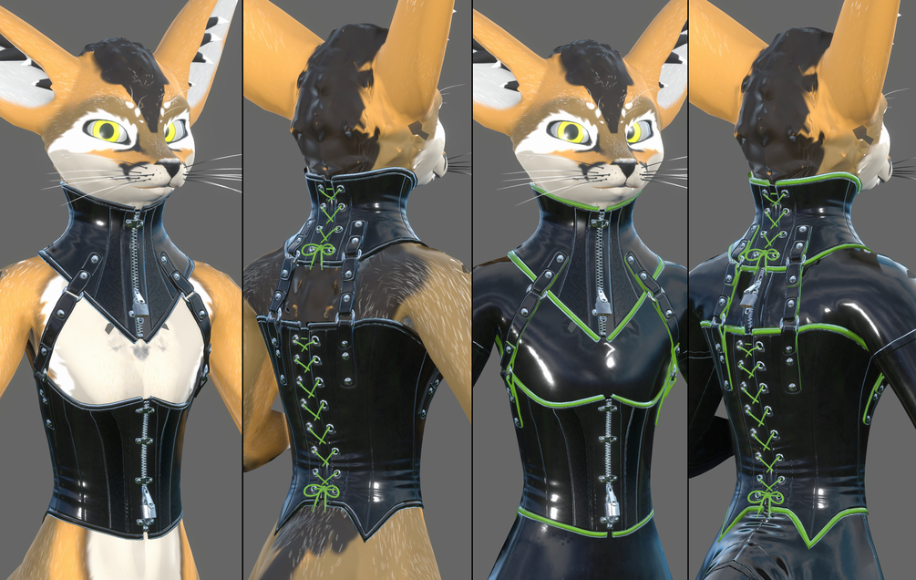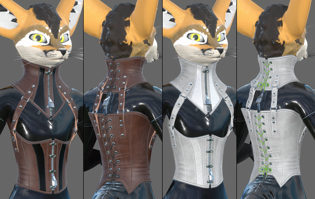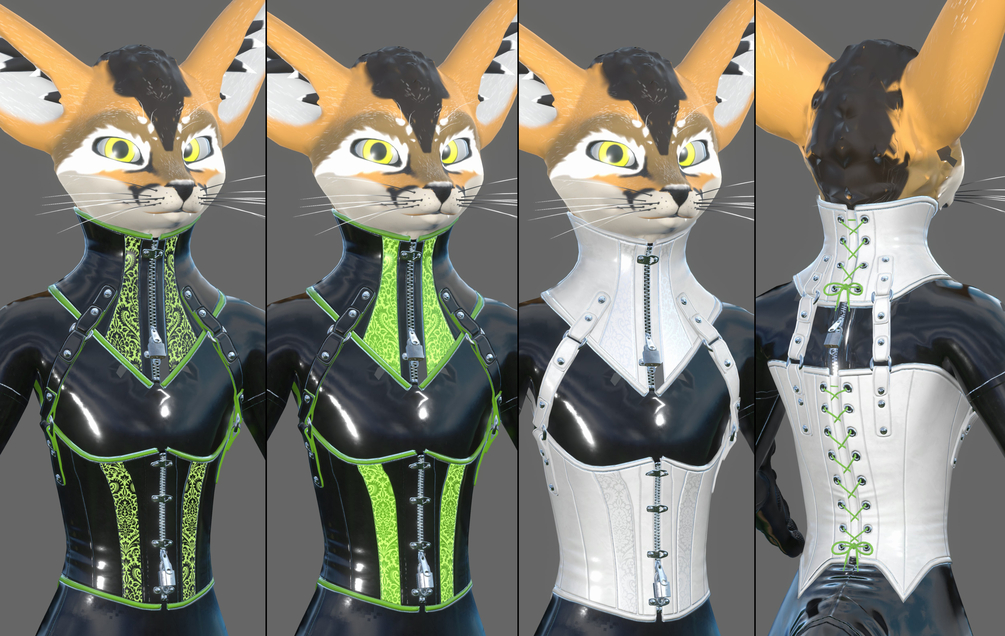 The Corset has blendshapes/shapekeys that match body shapes (Except for the belly/obesity ones) and allows it to overlap our Hoods. As well as the option to either hide the neck corset, the connector straps or the main corset itself.