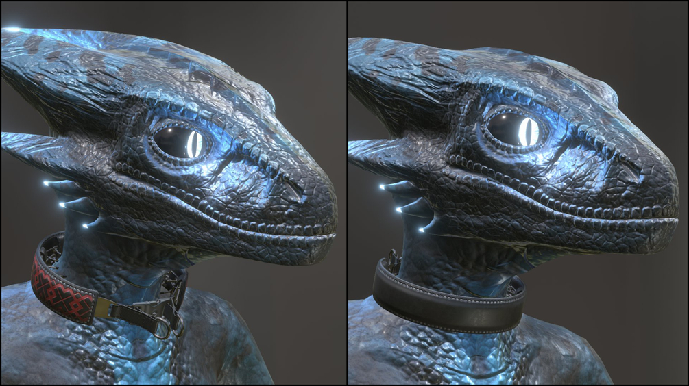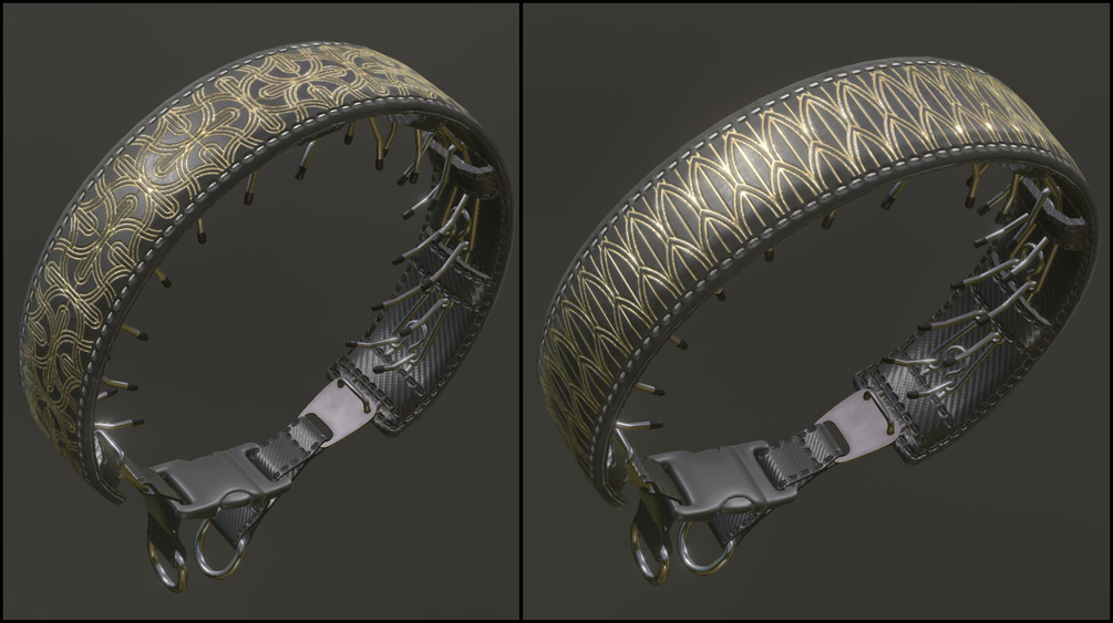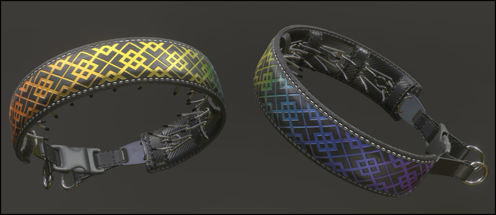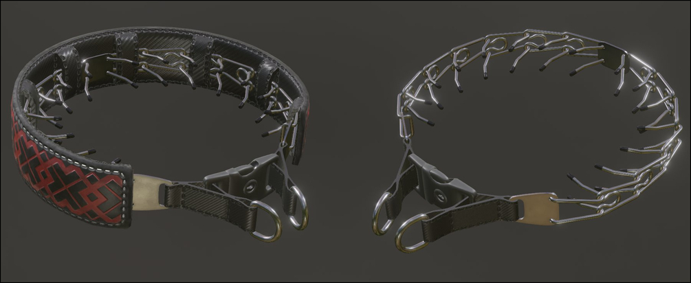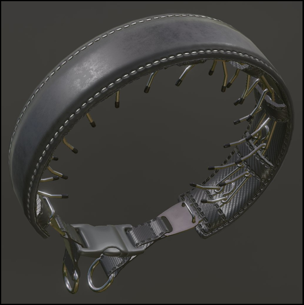The "Prongs" have a blendshape to hide the rubber blunts, leaving bare prongs, the collar has a blendshape to animate cinching as well. The leather exterior is its own object and can be separated to leave only the main prong collar itself.