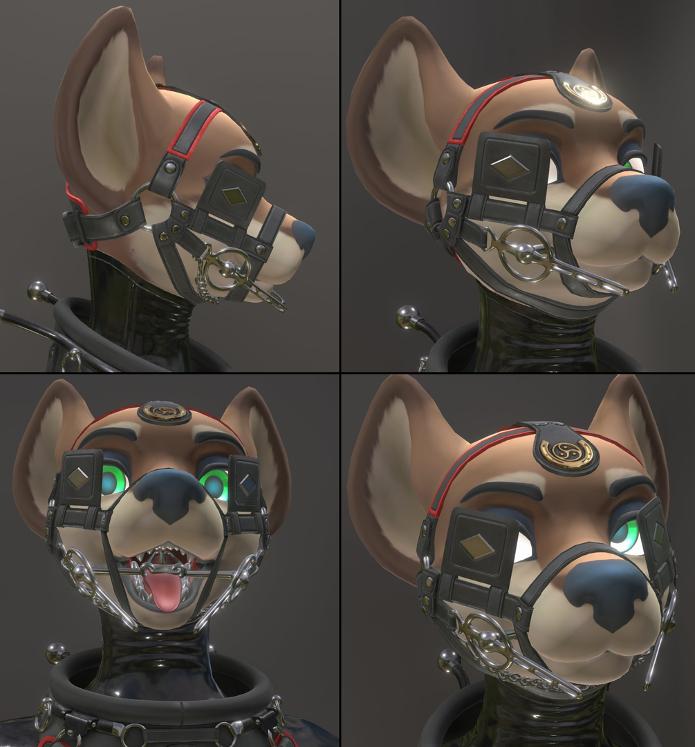 The gear has 'blendshapes' to make it fit the avatars various shapes for that perfect fit (including flat chest!) The bridle can have its jaw chain hidden and the blinkers can be splayed/narrowed or hidden as well.