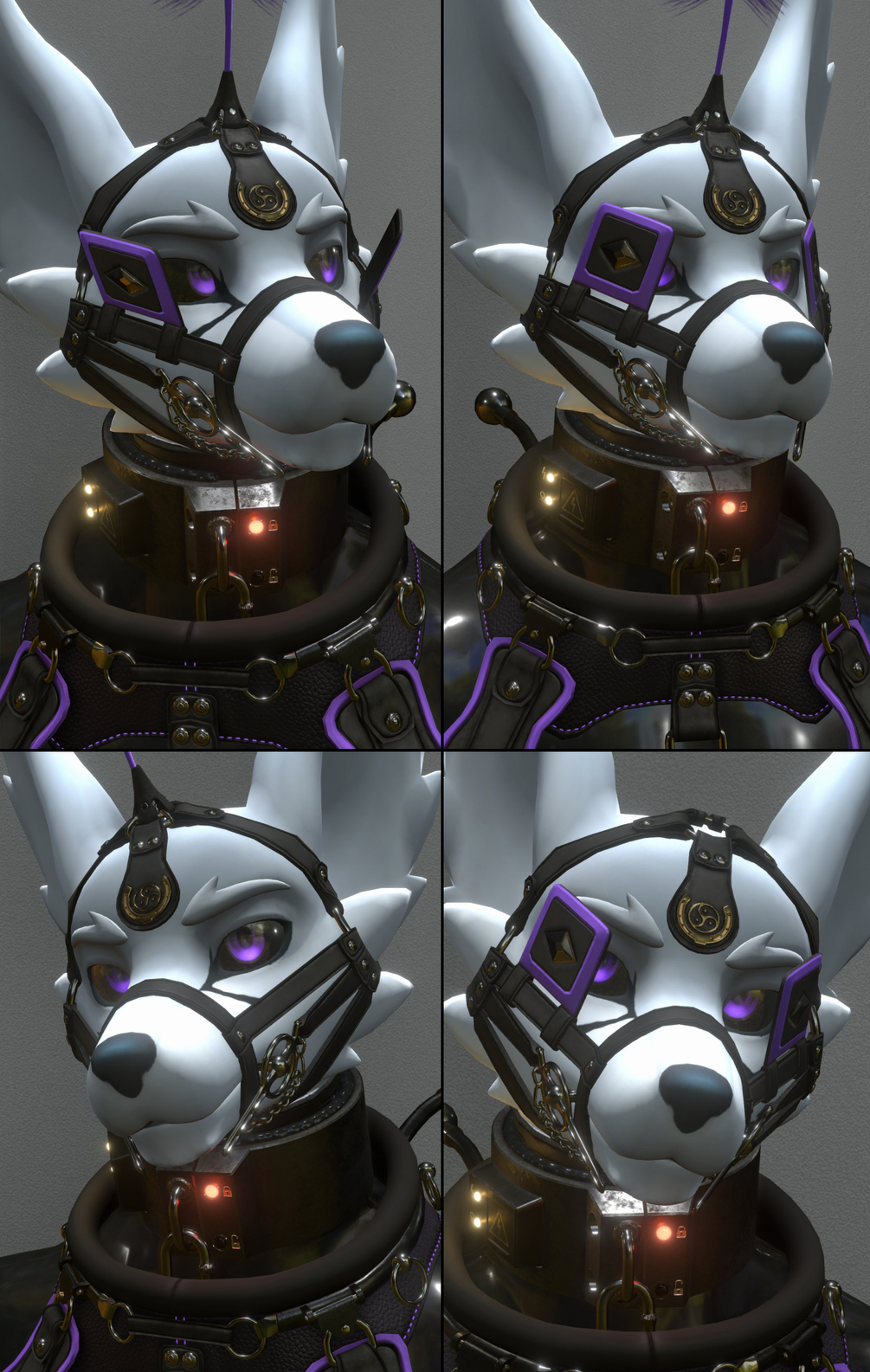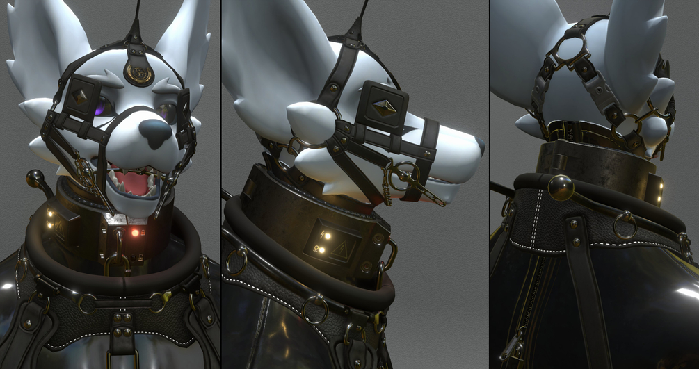 The gear has 'blendshapes' to make it fit the avatars various shapes for that perfect fit. Harness has the option to hide thigh (as well as waist) straps/belts. The bridle can have its jaw chain hidden and the blinkers can be splayed/narrowed or hidden as well.