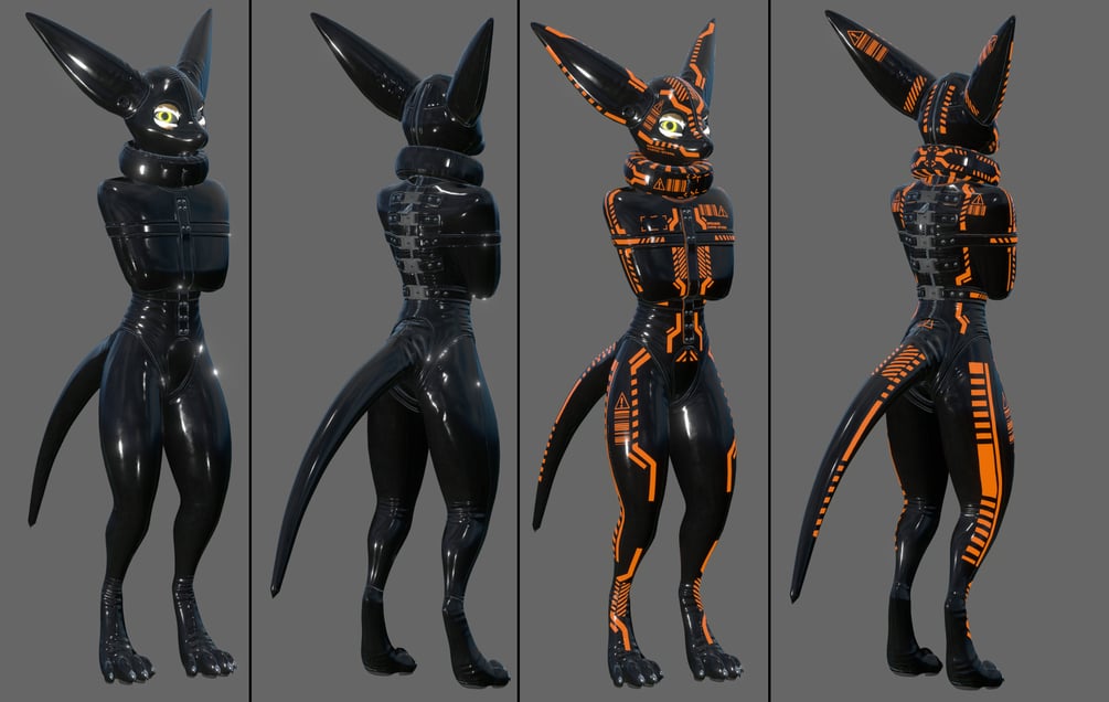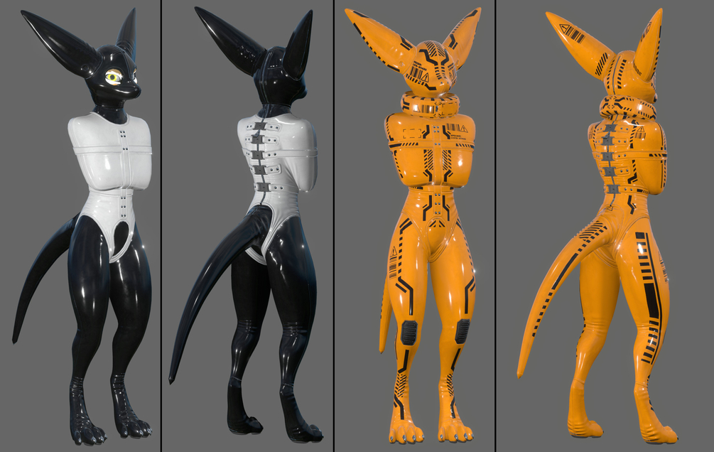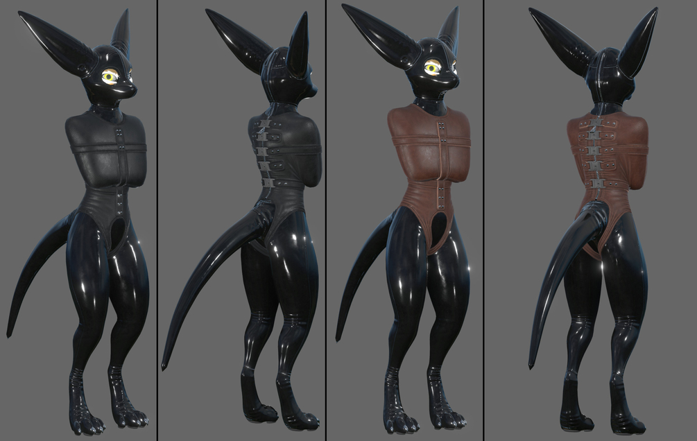 - Material options in Latex (Black, white, prison orange and lilac) and Leather (Black, white and brown)