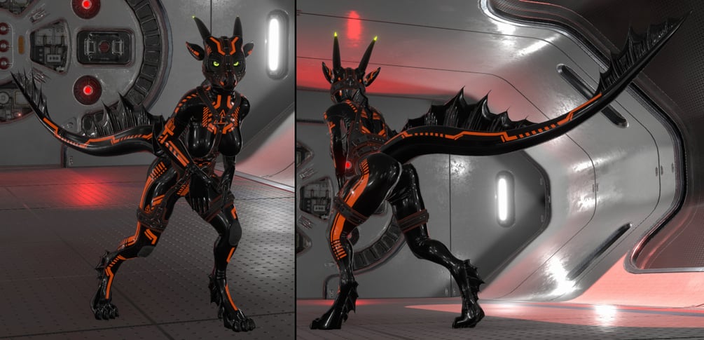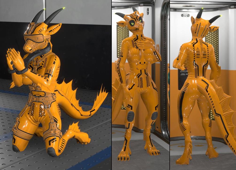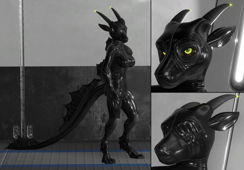 A Latex Outfit & Hoods Made for Kudalyn's Dragon avatar ( https://kudalyn.gumroad.com/l/kudragon )