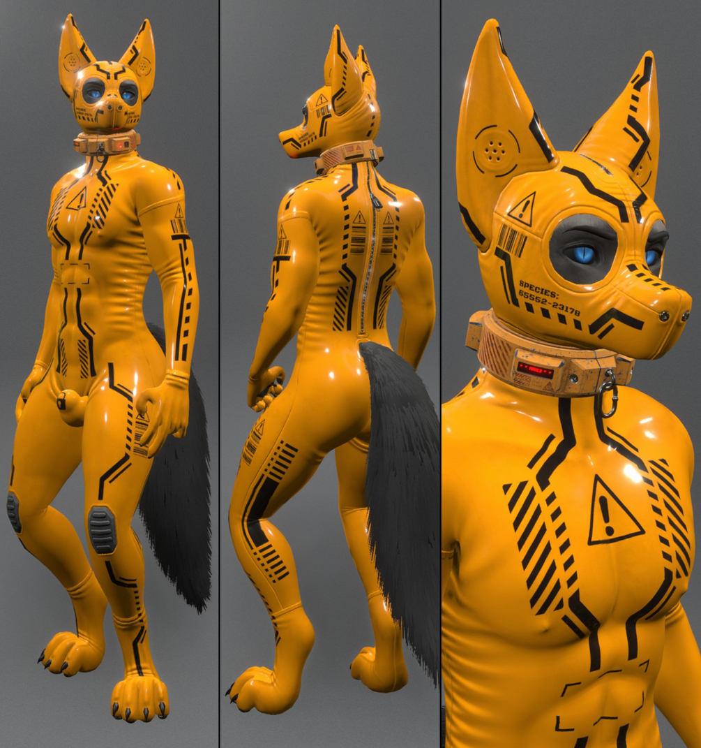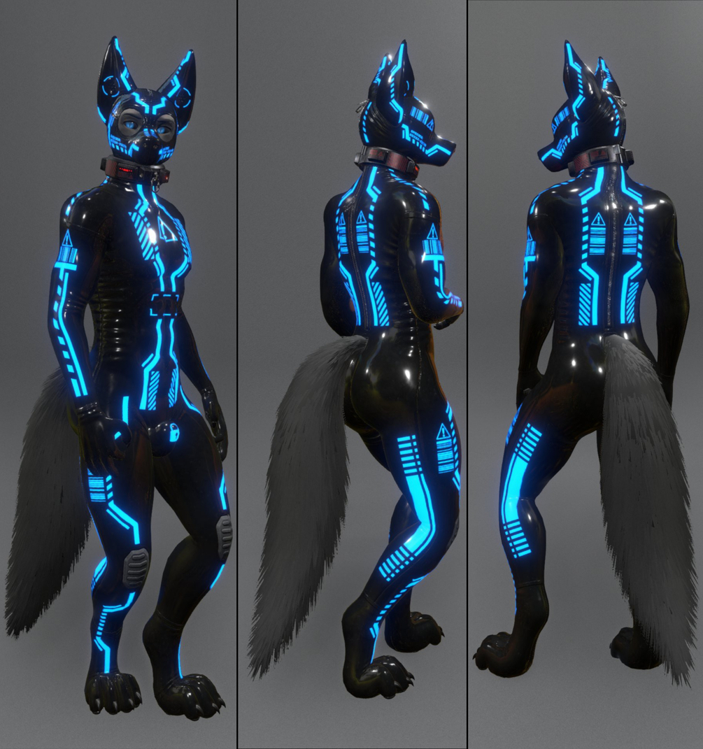 A Latex Outfit & Hoods Made for FoxiPaws' Archer Canine avatar ( https://foxipaws.gumroad.com/l/Archer )