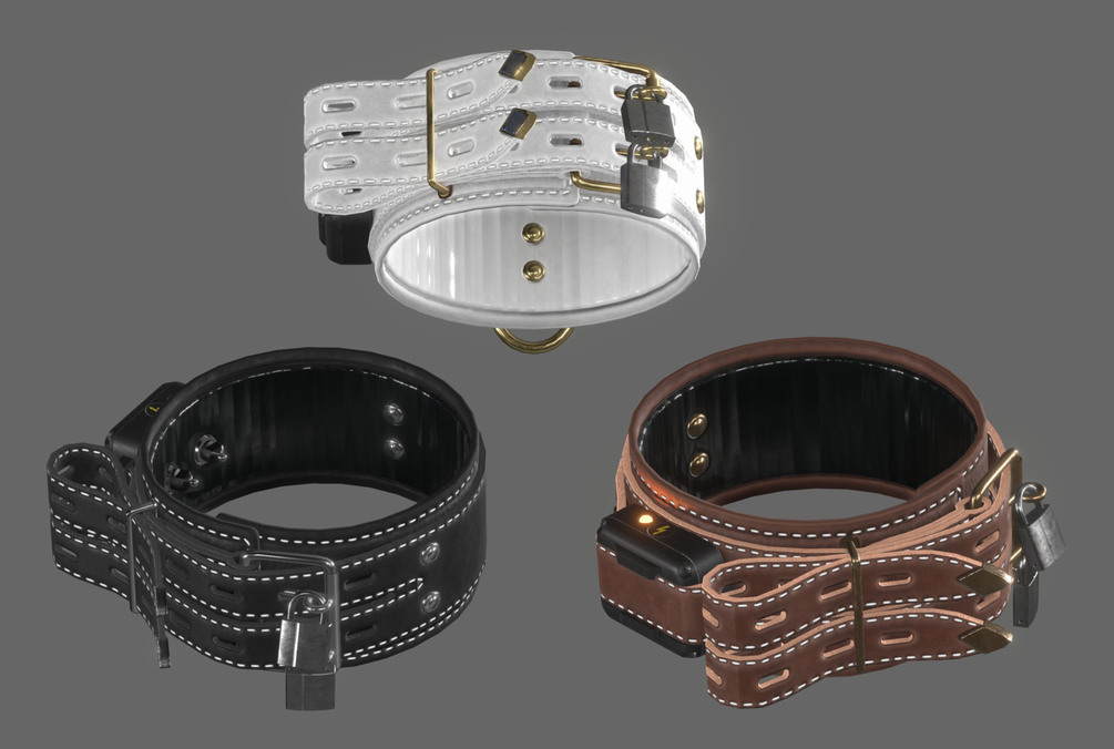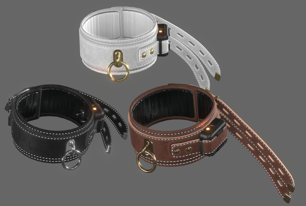 The binding straps have two variants: Loose straps with rigged bones to make them dynamic and then a variant with the straps tucked-in (see images for reference). The Core strap of the collar can be slimmed slightly with a blendshape, locking loops on the buckles can be hidden with a blendshape as well.